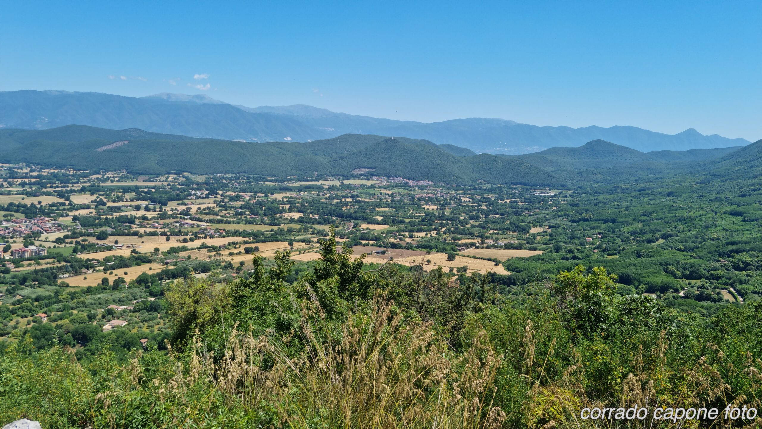 Tornato alla Santella per riprendere fiato, ho imboccato la sterrata verso Razzano. Qui, dal punto panoramico dove si erge un’altra croce a 625 metri, lo sguardo si è aperto su una vista che ripagava ogni singola goccia di sudore. I paesi sottostanti di Giano Vetusto, Pignataro Maggiore e Calvi Risorta si estendevano a perdita d’occhio, mentre all’orizzonte, nitide e quasi a portata di mano, si stagliavano le isole. Da qui si inquadra un tratto di autostrada del Sole, che poco più a nord incontrerà lo svincolo di Capua. Un ottimo colpo d’occhio prima di proseguire.
